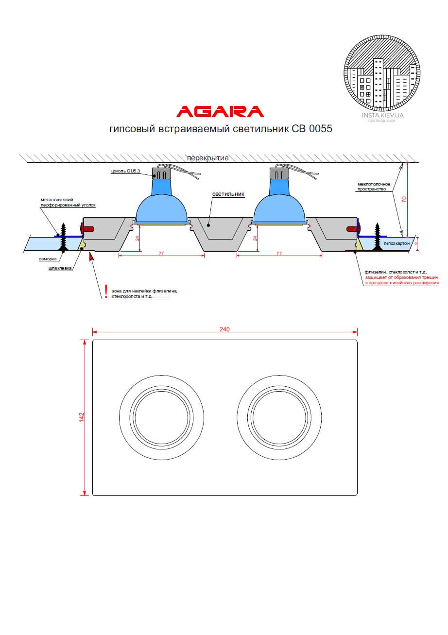 Предназначен для монтажа в потолок из гипсокартона, с дальнейшей заделкой швов, обработкой глубоко проникающей грунтовкой и покраской.