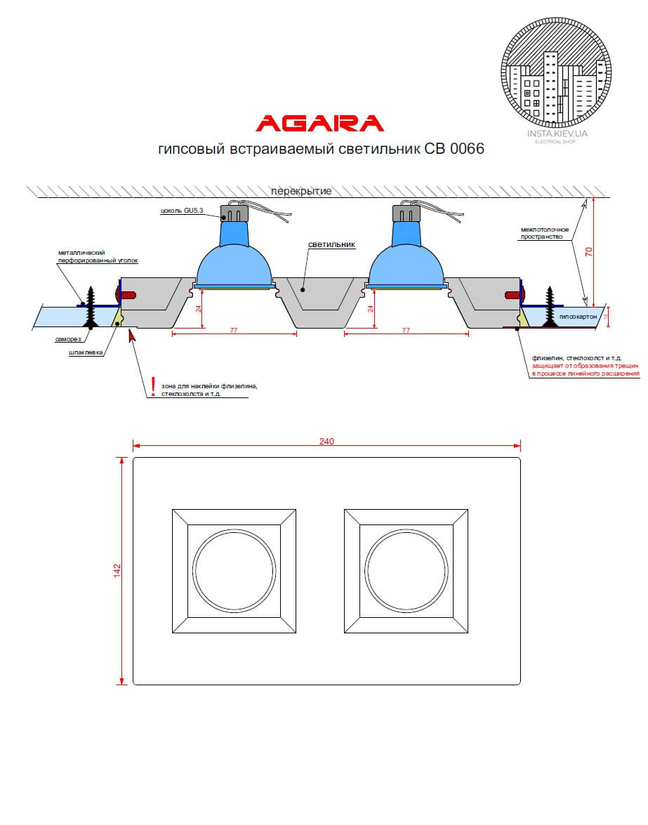 Предназначен для монтажа в потолок из гипсокартона, с дальнейшей заделкой швов, обработкой глубоко проникающей грунтовкой и покраской.