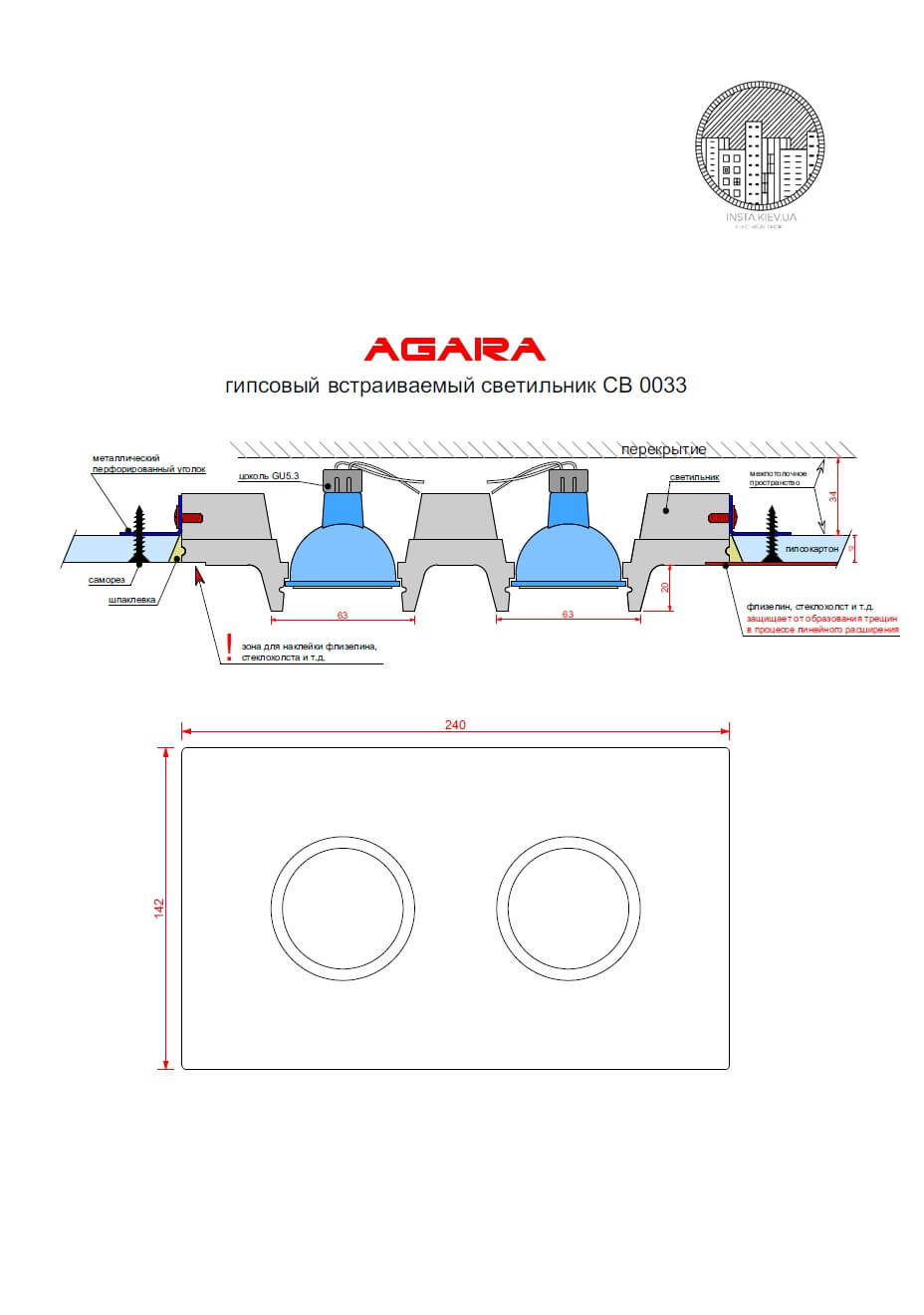 Предназначен для монтажа в потолок из гипсокартона, с дальнейшей заделкой швов, обработкой глубоко проникающей грунтовкой и покраской.